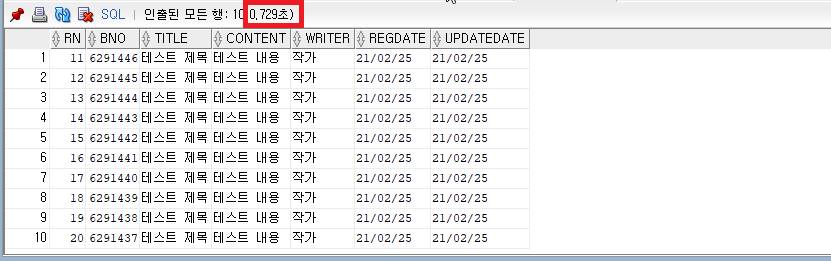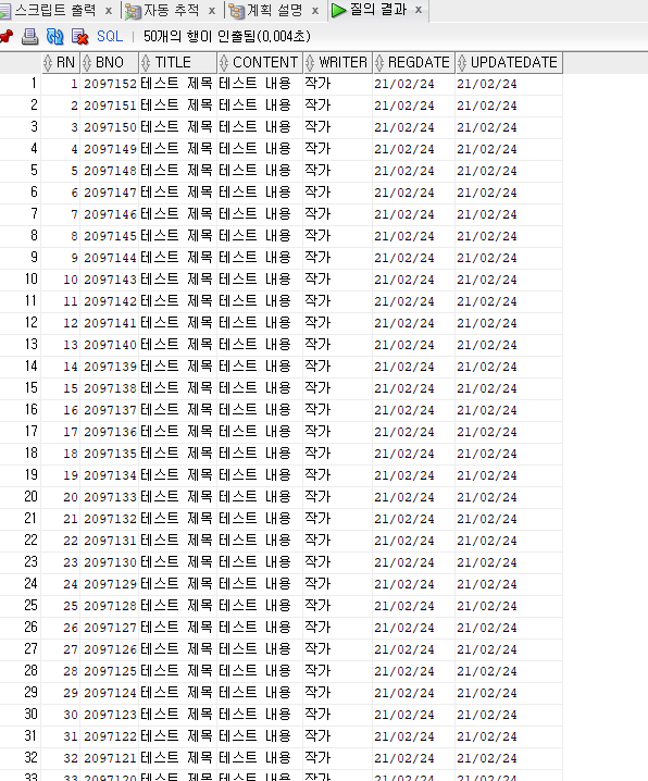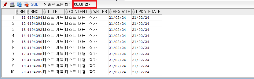 쿼리의 결과를 보면 최근에 저장된 행부터 출력된 것을 볼 수 있습니다. order by bno desc를 사용하지 않았음에도 이러한 결과가 나오는 이유는 오라클 힌트(Hint)를 사용하였기 때문입니다.