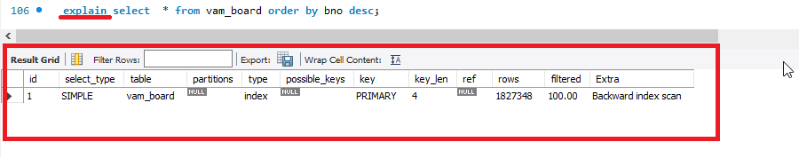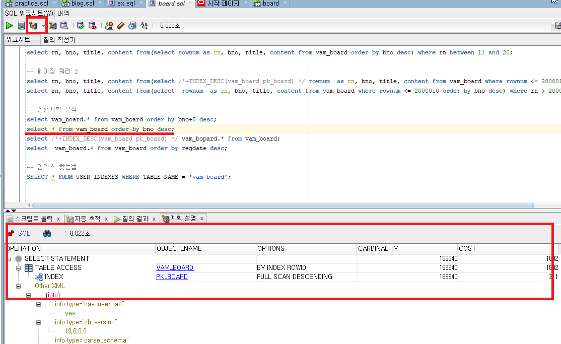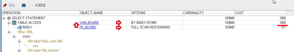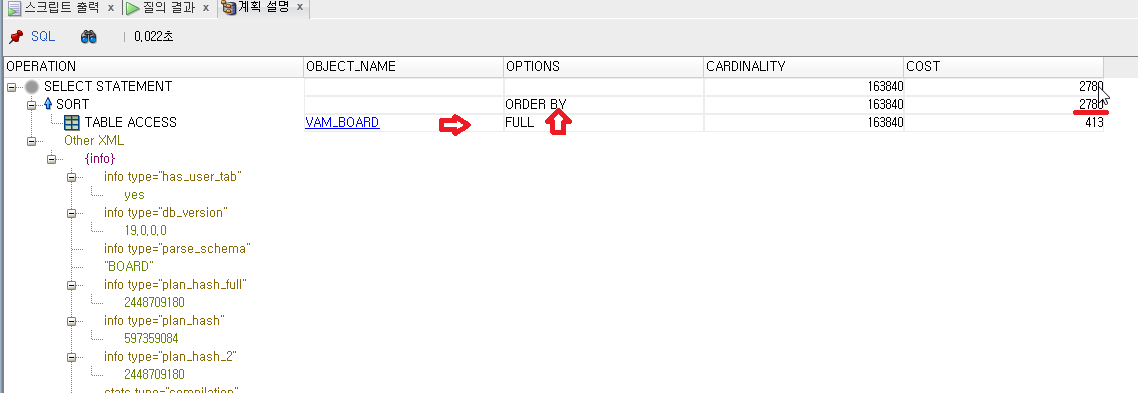 해석을 하면 VAM_BOARD 테이블 전체를 스캔(FULL) 한 후 이를 다시 정렬(ORDER BY) 하는 순으로 계획되어 있습니다. 정렬을 하는 과정에서 상당히 많은 비용(COST)가 발생합니다. 인덱스를 사용하는 방식과는 다르게 정렬(ORDER BY) 과정에서 상당히 많은 비용(COST)가 발생하였습니다.