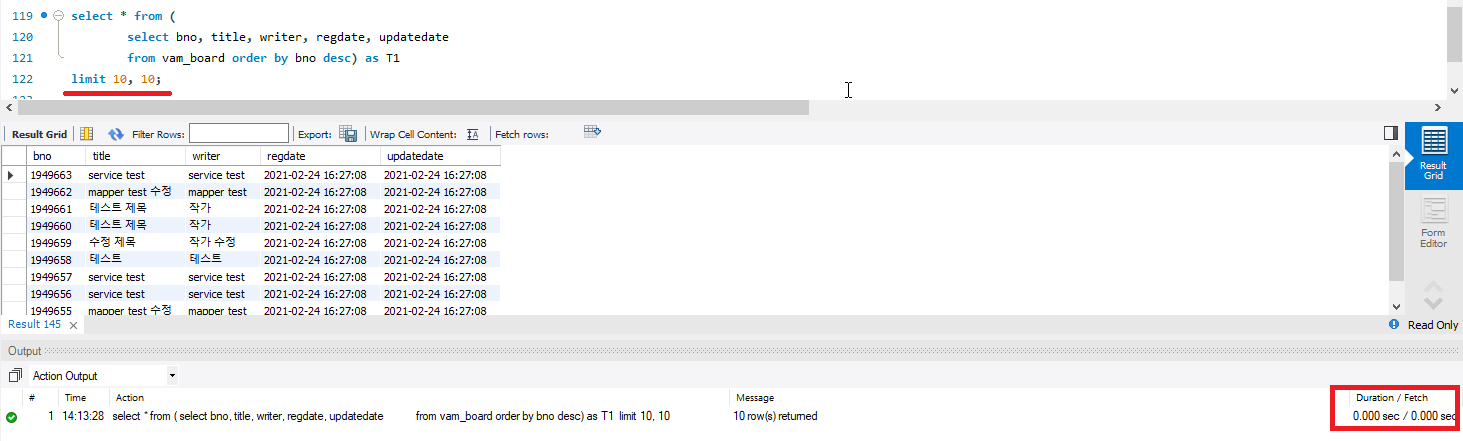 LIMIT 방식을 활용하여 bno기준 역순으로 정렬된 테이블에서 11번째 행과 20번째 행을 출력하는 쿼리입니다.