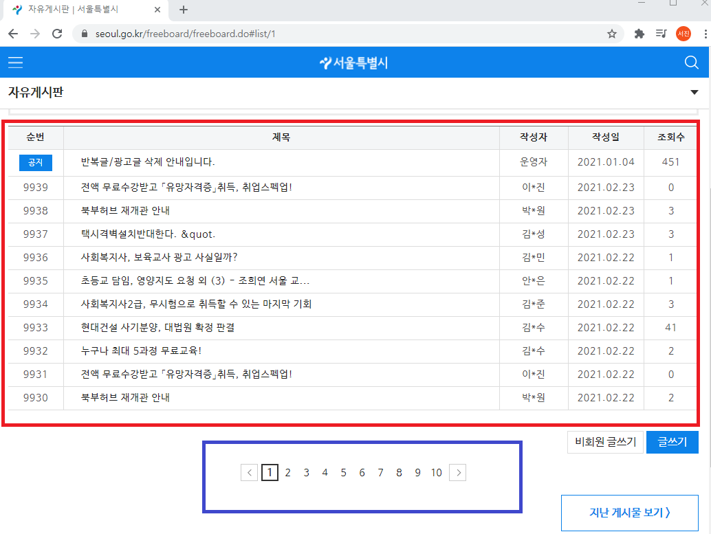 이러한 문제점을 보안하기 위해서 "페이징 기법"을 사용할 것입니다. 페이징 기법은 수많은 자료 데이터(행, 레코드)를 일정 크기로 나누어서, 나누어진 하나하나의 집단에 페이지 번호를 부여하는 방식입니다. 정해진 갯수와 원하는 영역의 게시판 데이터를 불러오고 출력한다면 '가독성'의 문제와 '자원 낭비' 문제점이 보완될 것입니다.