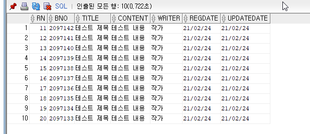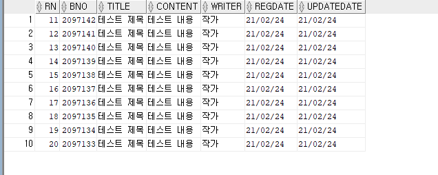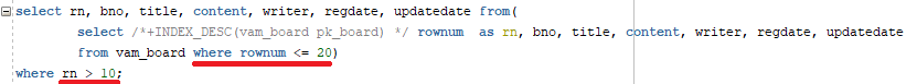 rownum 칼럼(Column) 추가와 bno 기준으로 역순으로 정렬된 테이블에서 11번째 행과 20번째 행을 출력하는 쿼리입니다.