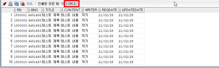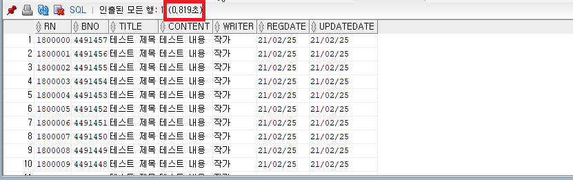rownum 앞 번호를 검색하는 경우 위의 그림 18, 그림 19와 같이 매우 큰 성능 차이가 보입니다. 하지만 rownum 뒷번호(1,800,000 ~ 1,800,010)를 검색한 경우는 속도 차이가 거의 없습니다.