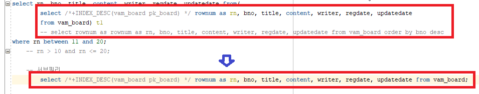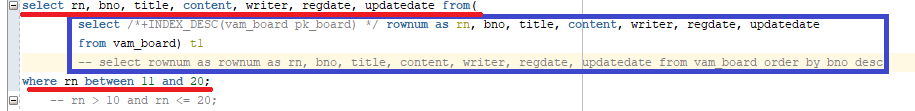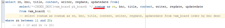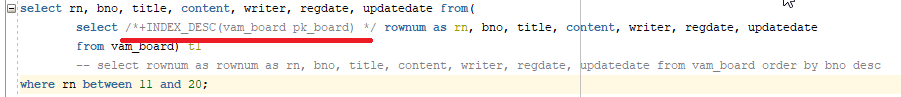 select /*+INDEX_DESC(vam_board pk_board) */ rownum as rn, bno, title, content, writer, regdate, updatedate