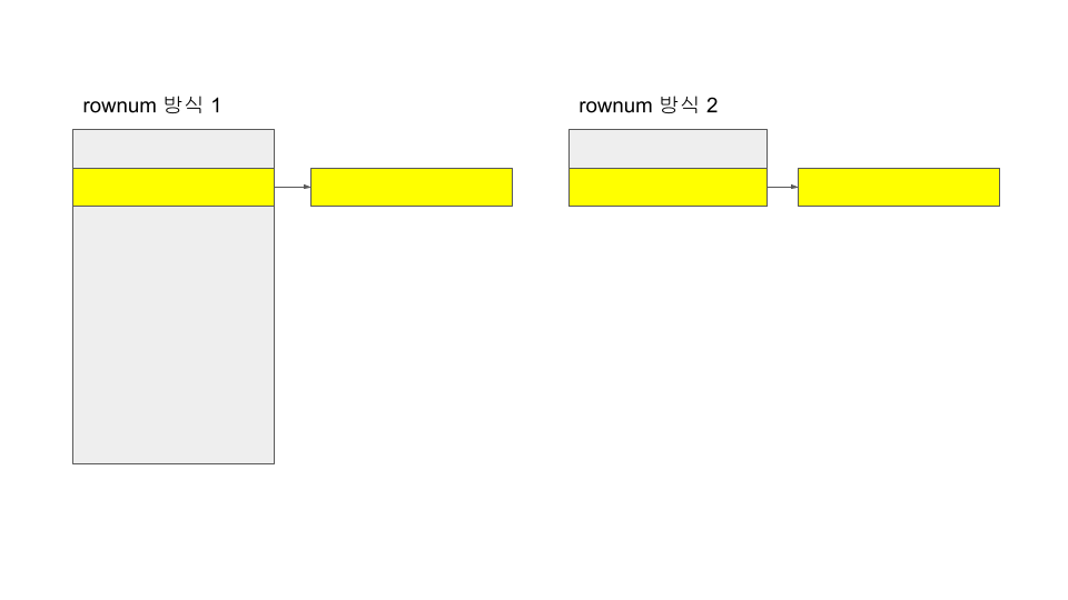 rownum 앞번호를 검색하는 경우에는 'Rownum 방식 1'의 서브 쿼리에서 반환하는 테이블의 크기와 'Rownum 방식 2'의 서브쿼리에서 반환하는 테이블의 크기의 차이 때문에 검색 속도가 차이 납니다. rownum 11부터 20까지의 행을 검색하는 쿼리를 예로 들면 'Rownum 방식 1'의 경우 서브 쿼리에서 테이블이 가지고 있는 200만 개의 행을 모두 검색한 테이블을 반환합니다. 하지만 'Rownum 방식 2'의 경우 서브 쿼리는 검색조건에 의해 20개의 행만 검색 후 테이블을 반환합니다. 정리하면 서브 쿼리의 조건으로 인해 불필요한 검색을 하지 않음으로써 시간을 절약하여 검색 속도를 향상했습니다.