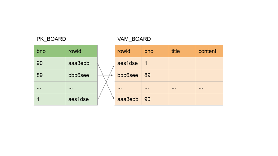 위의 실행 계획을 해석해보면 PK_BOARD '인덱스'를 전체 역(DESC) 순으로 스캔을 합니다. 그리고 '인덱스'에는 실제 테이블에 저장되어 있는 각행의 주소인 'ROWID'가 존재하는데, 해당 'ROWID'를 사용해서 실제 테이블(VAM_BOARD)의 데이터들을 연결해주는 작업이 진행됩니다.