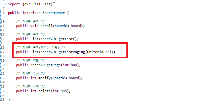 - 기존 '게시물 목록(getList())' 메소드 역할을 하면서 단지 쿼리만 조금 수정되는 것이기 때문에 반환 타입은 동일하게 List <BoardVO>를 작성합니다.