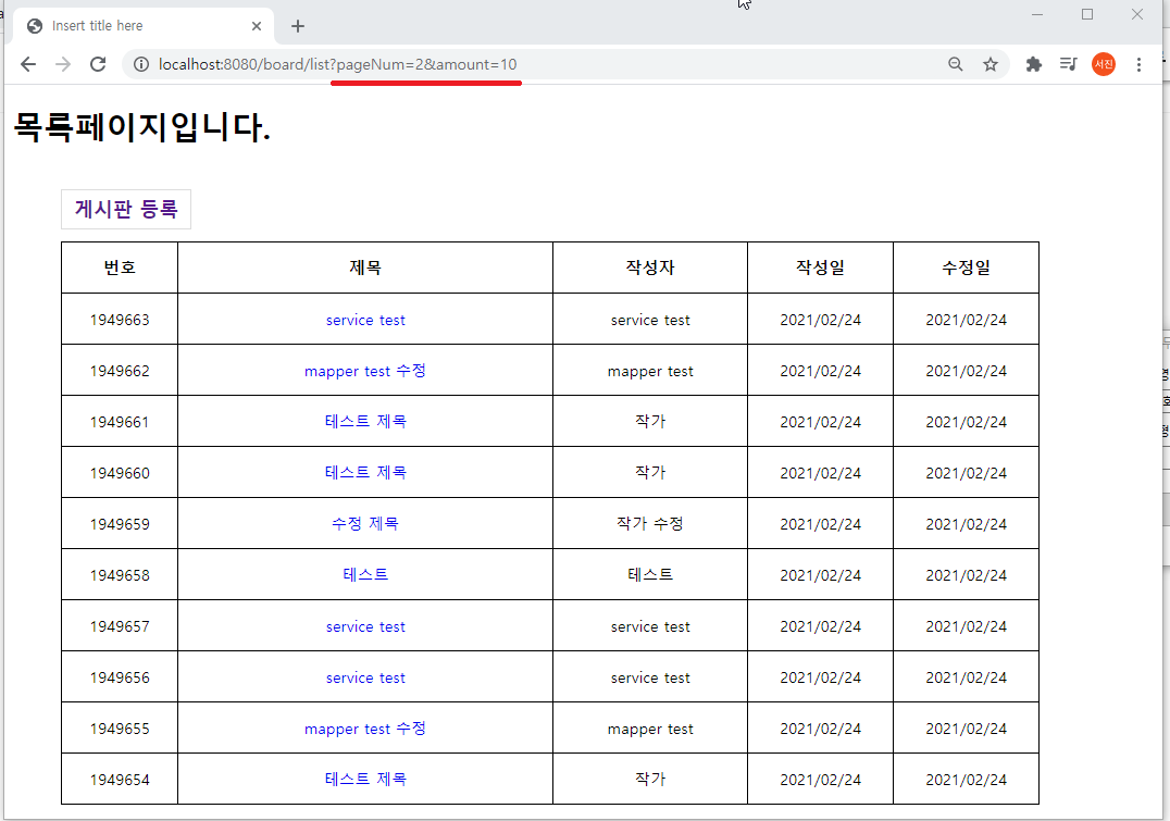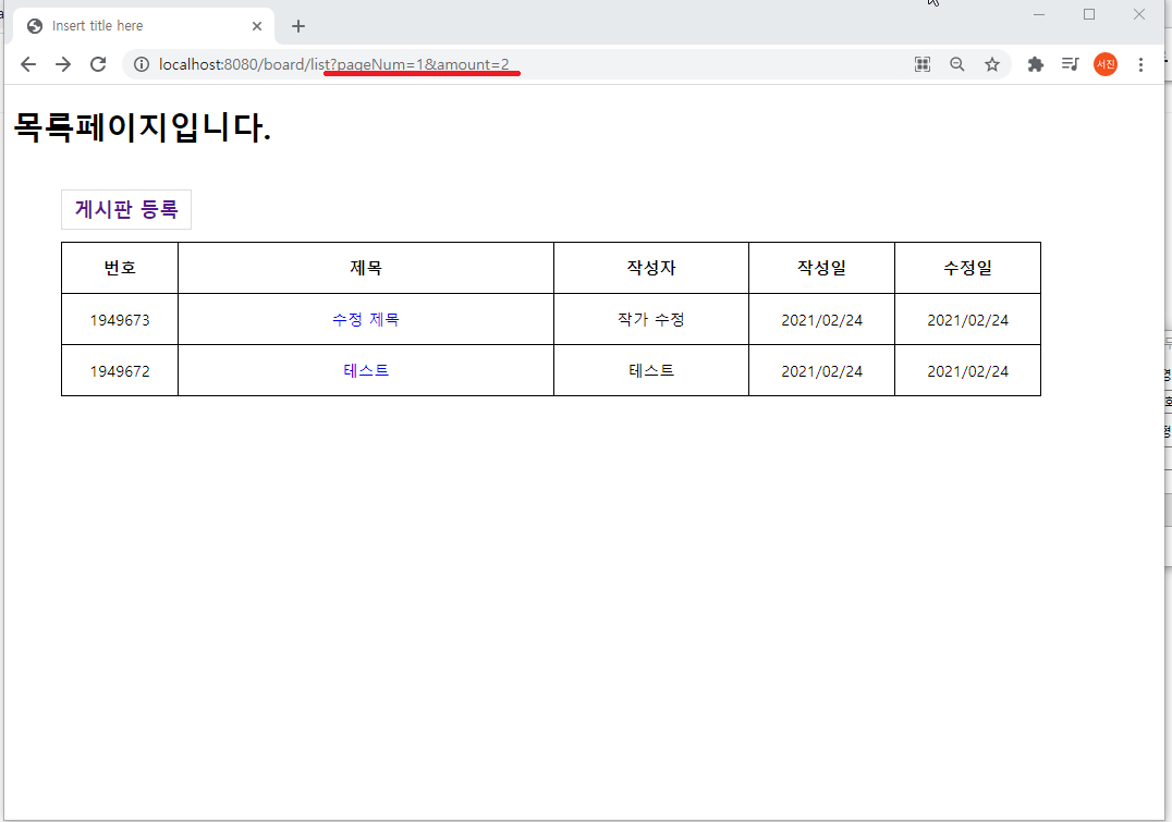 정상적으로 출력이 되는 걸 확인하였다면 쿼리 스트링을 통해 pageNum과 amout값을 직접 삽입하여 작동하는지 테스트합니다.