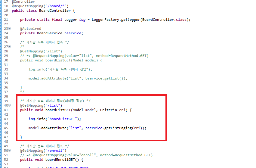 기존 "/board/list" url 매핑 메소드를 주석처리하거나 삭제 후 아래의 코드를 추가합니다. (기존 메소드를 활용하여 수정해도 상관없습니다.)
