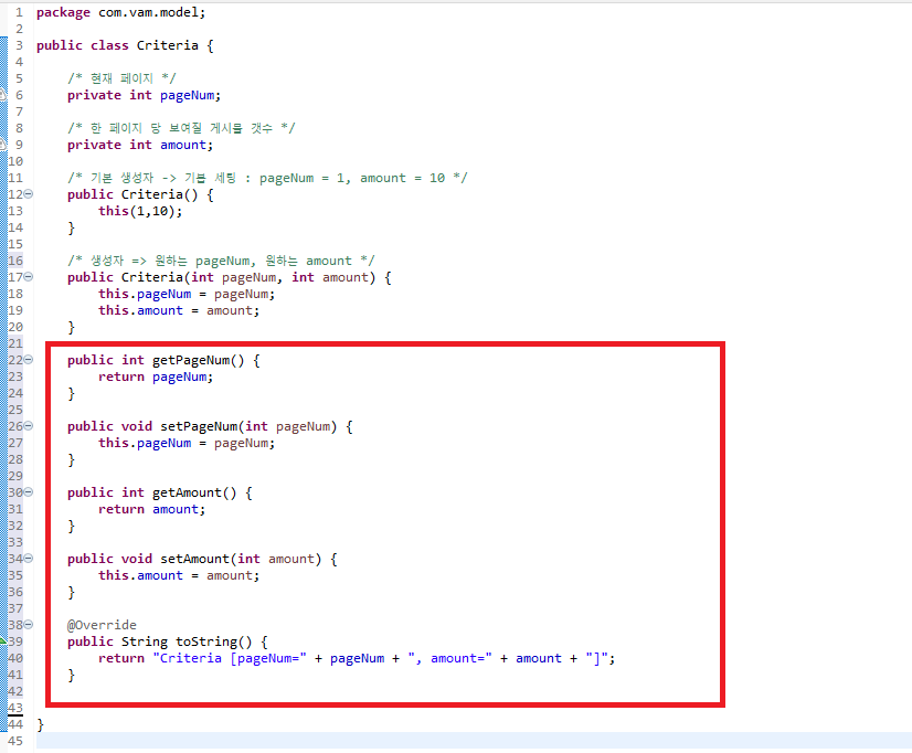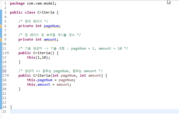 - 파라미터 없이 Criteria 클래스를 호출하였을 때는 기본적으로 pageNum은 1, amount는 10을 가지도록 생성자를 작성하였습니다.