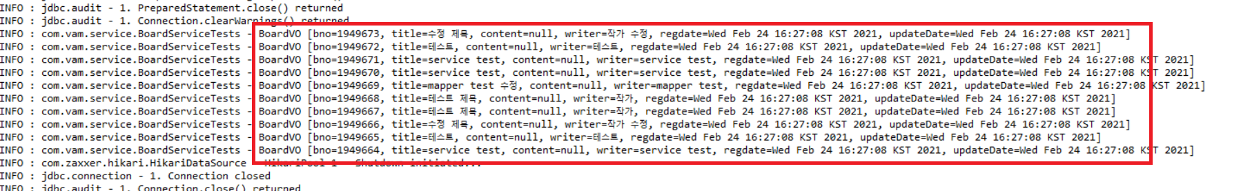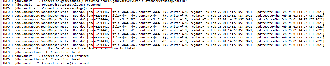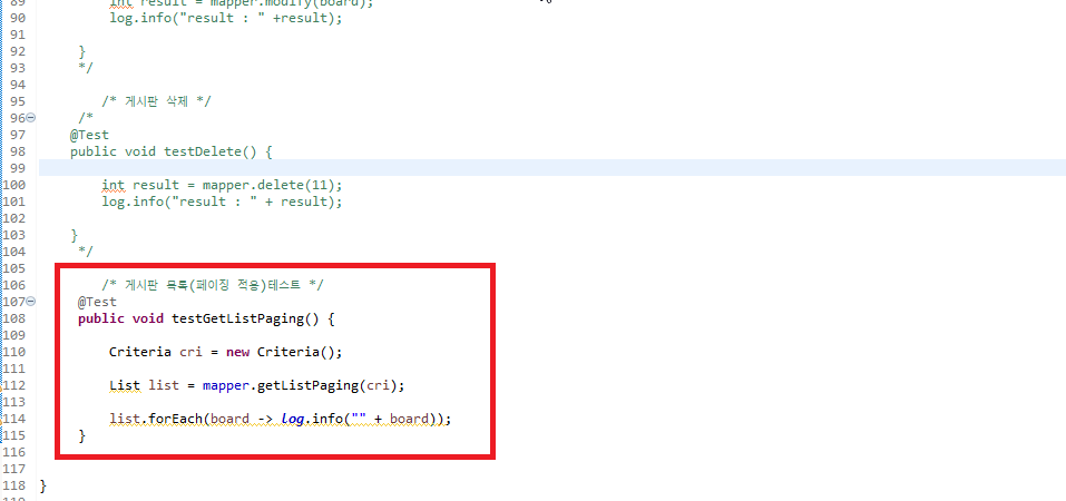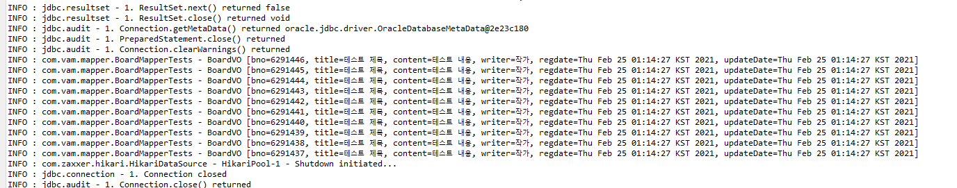 작성한 Mapper 메소드를 테스트합니다. src/test/java 경로의 com.vam.mapper 패키지에 있는 BoardMapperTests.java 에 아래의 코드를 작성하여 Junit 테스트합니다.