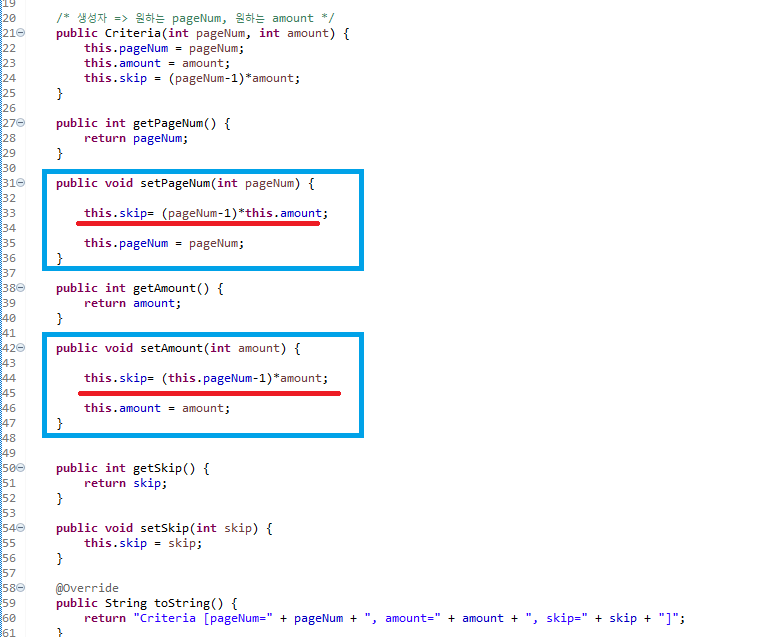 3개의 변수 모두 getter/setter, toString 메소드를 추가해줍니다. setAmount(), setPageNum() 메소드를 호출한다는 것은 amount, pageNum 값을 변경한다는 것을 의미합니다. 따라서 skip의 값또한 변경되어야 하기때문에 해당 메소드 구현부에 skip값이 변경되도록 코드를 추가합니다.