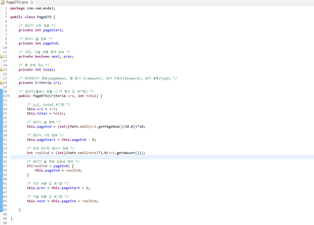 com.vam.model 패키지에 PageDTO 클래스를 생성후 아래의 변수, 생성자를 작성합니다. PageDTO 클래스의 데이터들은 '페이지 이동 인터페이스'를 출력시키는데 필요로 한 데이터들의 모임입니다.
