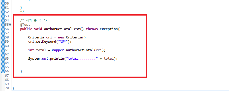 AuthorMapperTests.java에서 작성한 Mapper 메서드가 정상적으로 동작하는지 junit 테스트를 합니다.