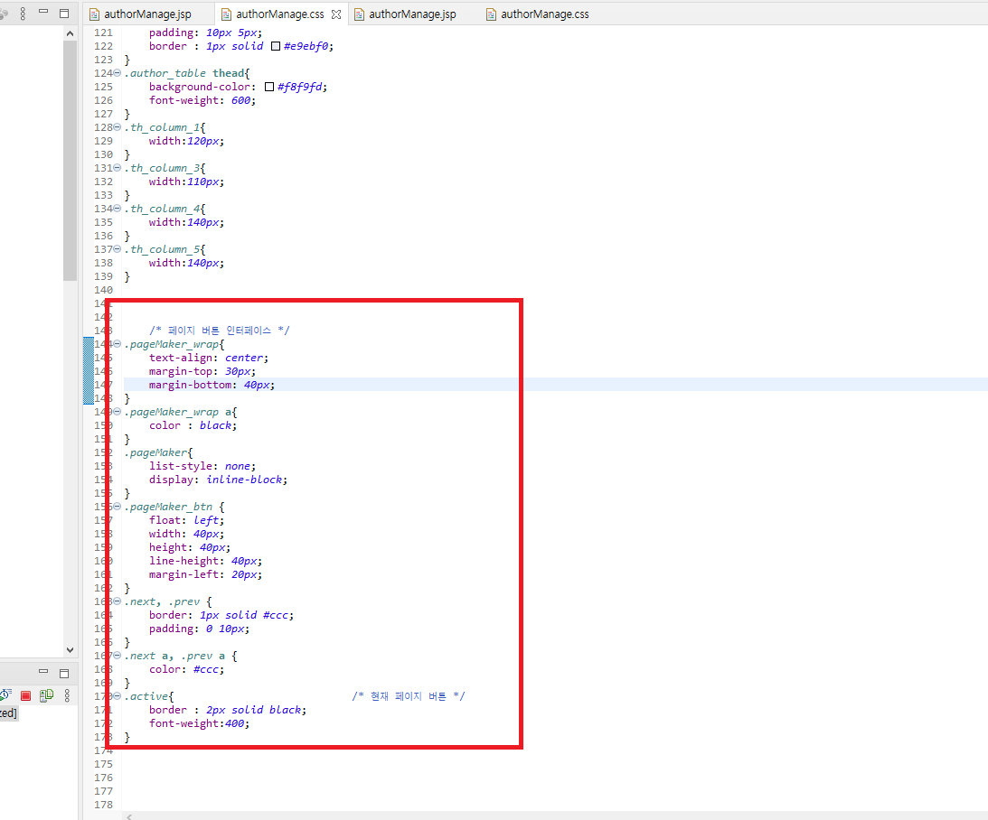 뷰(view)에 출력되는 '페이지 이동 인터페이스'를 꾸며주기 위해 아래의 css코드를 authorManage.css 파일에 추가하였습니다.