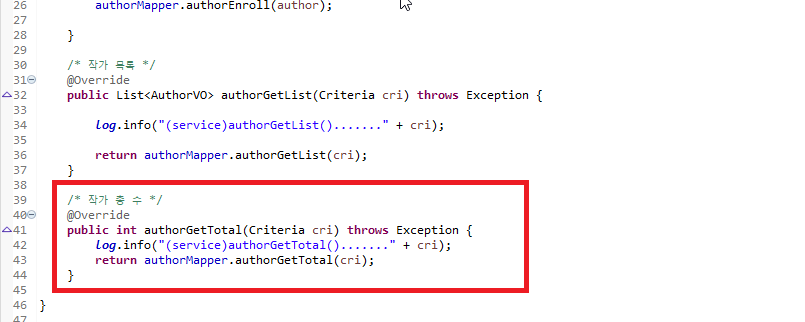total의 값을 얻기 위해 AuthorService 클래스의 authorGetTotal()을 호출한 후 해당 값과 Critera 클래스 데이터를 인자 값으로 부여하여 PageDTO를 인스턴스화 시킵니다.