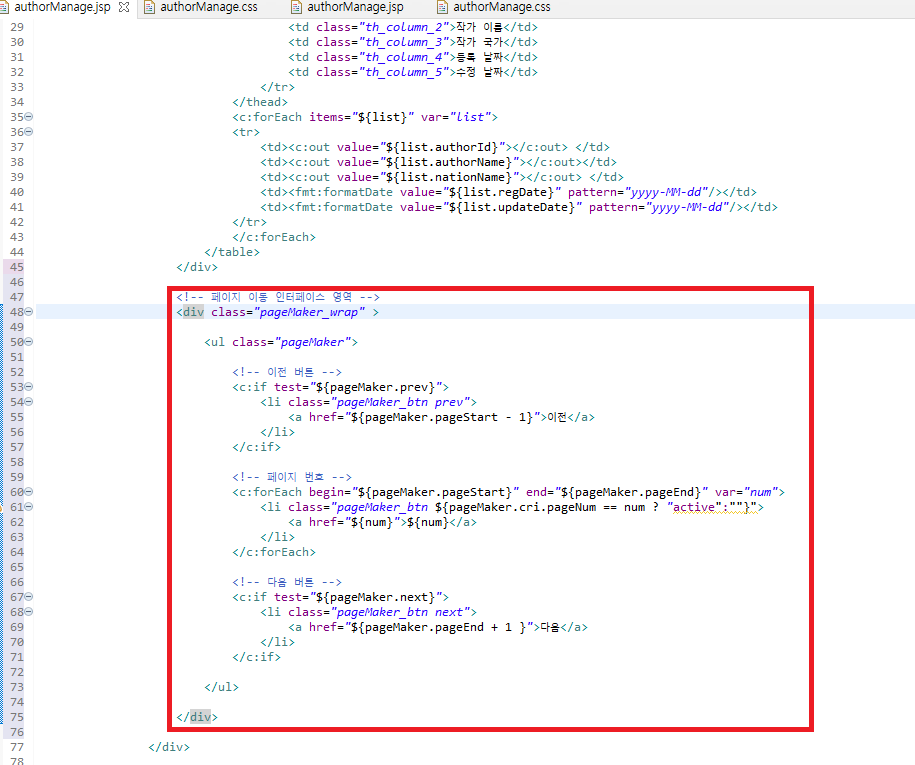 서버로부터 전달받은 "pageMaker" 데이터를 활용하여 '페이지 이동 인터페이스'를 구현합니다. class 속성 값이 "author_table_wrap"인 <div> 태그 바로 다음 순서에 아래의 코드를 추가해줍니다. ( 코드를 읽어보고 이해가 잘 안 되신다면 "[스프링 게시판][6] 페이징 기능 구현(페이지 이동 인터페이스) -1"를 참고해주세요.)