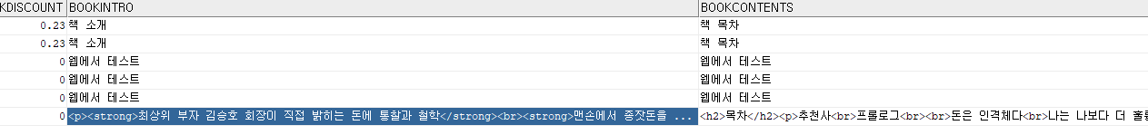 에디터를 적용한 입력란에 데이터를 입력한 뒤에 '상품등록' 기능을 실행하면 정상적으로 데이터가 등록되는지 확인합니다. 더불어 DB에 에디터가 변환한 데이터가 저장되었는지 확인합니다.
