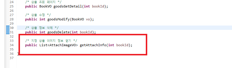 파일을 삭제하기 위해선 이미지 파일에 대한 정보가 필요로 합니다. 따라서 'bookId' 데이터를 활용하여 상품 이미지 정보를 DB로부터 가져올 수 있도록 Mapper, Service 메서드를 작성하겠습니다.