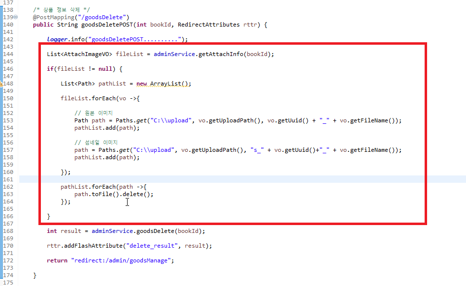 기존 "/admin/goodsDelete" url 매핑 메서드(goodsDeletePOST)에 코드를 추가하겠습니다. 서버 파일 삭제를 가장 먼저 처리하도록 만들 것이기 때문에 구현부 최상단에 작성해주겠습니다.