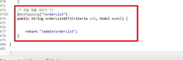 '주문 현황 페이지' 요청을 수행하는 URL 매핑 메서드를 만들어 주겠습니다. com/vam/controller 패키지에 있는 AdminController 클래스에 URL 매핑 메서드를 추가해줍니다. 파라미터로 검색 조건을 전달받을 수 있도록 Criteria를 부여해주었고, 뷰로 데이터를 전달하기 위해 Model을 부여해주었습니다.