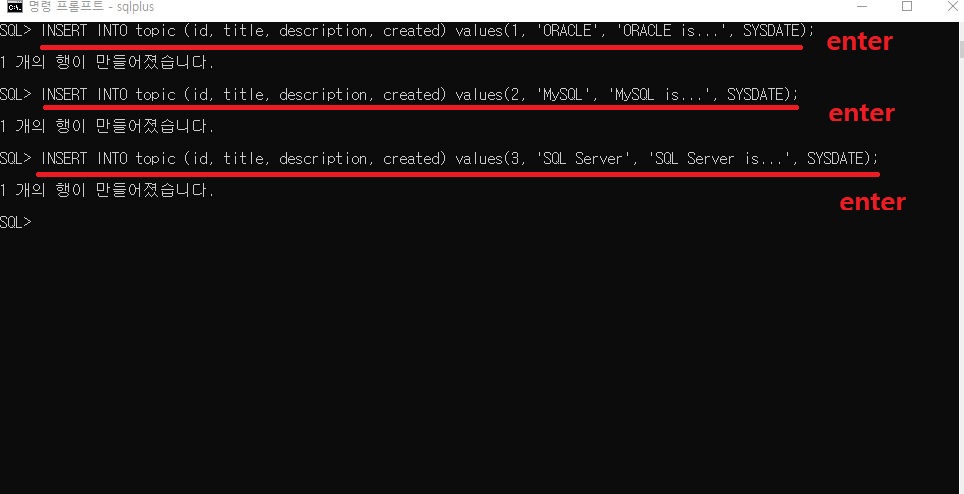 1. Sql Plus에서 아래의 문장을 처넣은 후 Enter를 치면 삽입이 진행됩니다.