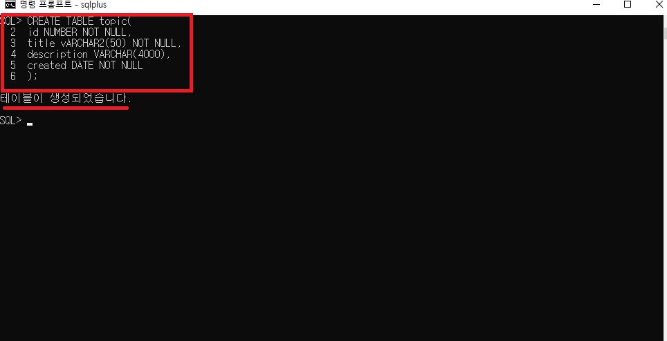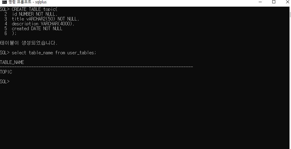- 칼럼명은 id, title, description, created가 만들어지고 각각의 데이터 타입은 NUMBER[숫자], VARCHAR2(50)[최대크기 50 가변문자], VARCHAR2(4000)[최대그기 4000 가변문자] , DATE[날짜형식] 이 지정되었습니다.